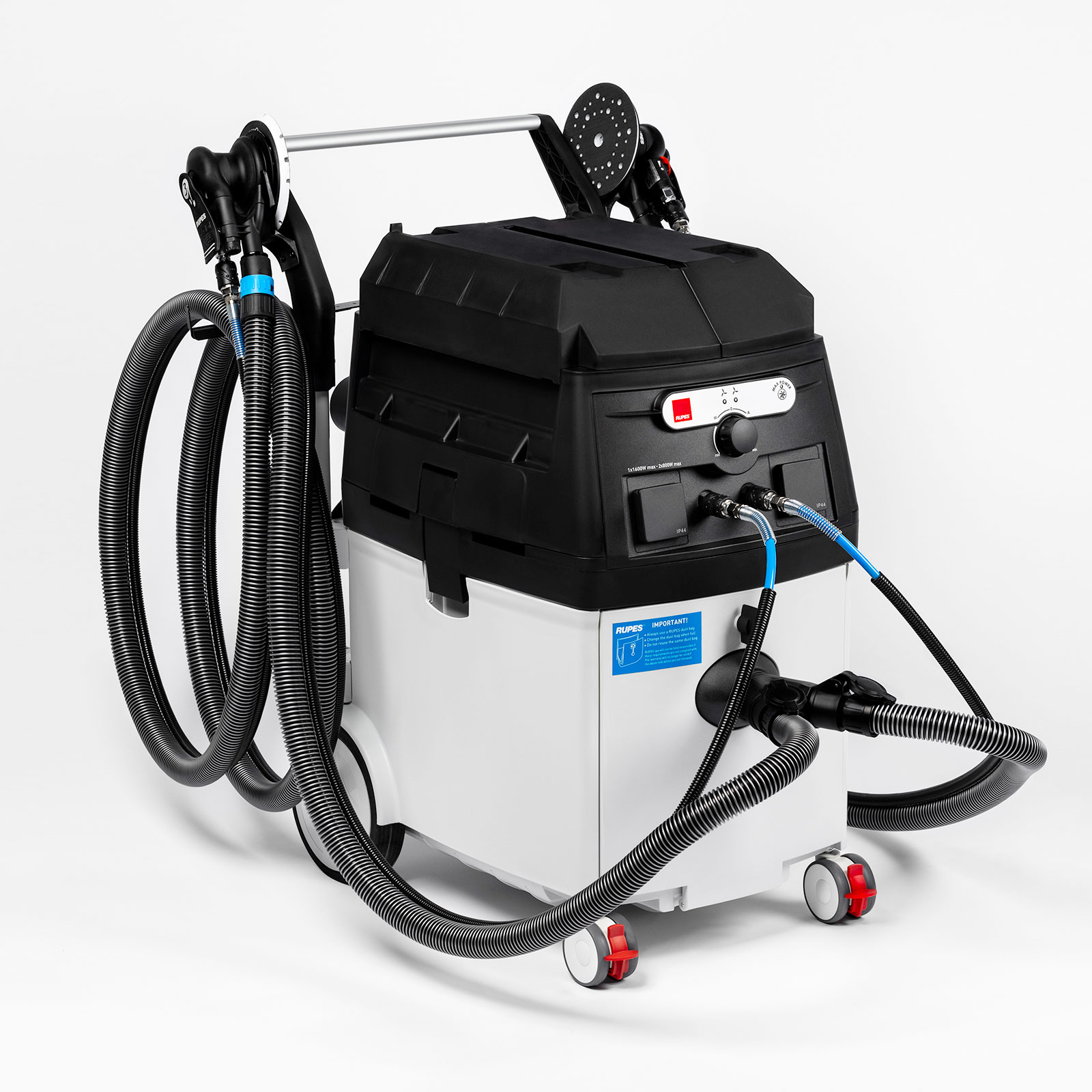 Rupes KS300 är en kompakt och tystgående slipdammsugare med integrerad arbetsstation, två 1200W motorer och en kapacitet på 45 liter. Dammklass H med 3-stegsfiltrering och en total filteryta på 5 m² inklusive HEPA H14-filter. Utrustad med dubbla el- och tryckluftsuttag med autostartfunktion och integrerad arbetsplattform. Klarar både våt- och torrsugning och kan användas av två operatörer samtidigt.