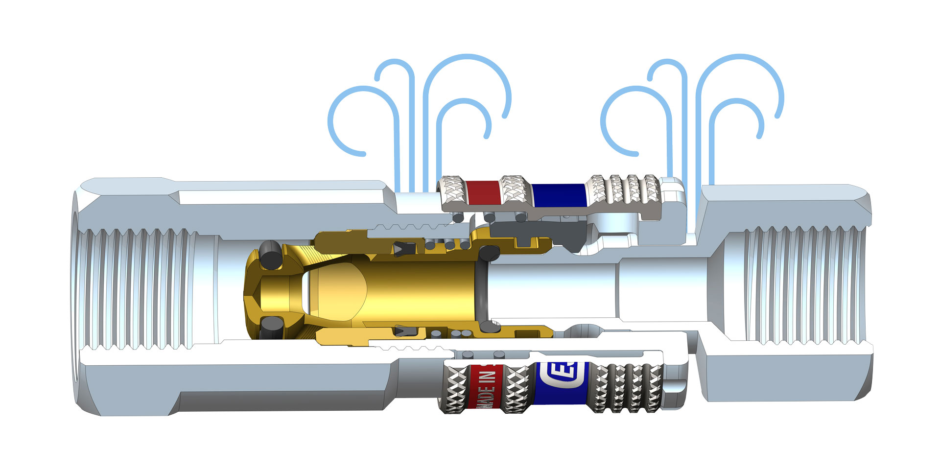 Vid frånkoppling ventilerar eSafe trycket automatiskt innan kopplingen frigörs. Detta eliminerar rekyler och minskar ljudnivån avsevärt, vilket bidrar till en tryggare och mer bekväm arbetsmiljö. Den ventilerade säkerhetsfunktionen uppfyller ISO 4414, vilket garanterar en säker hantering.