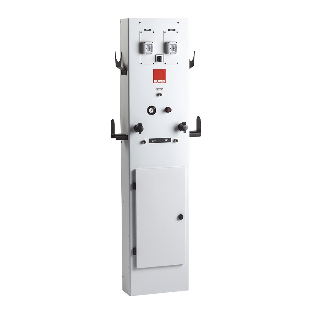 För trycklufts- och eldrivna slipmaskiner. Elegant design och kompakta yttermått kännetecknar denna energistation från Rupes. Förser arbetsplatsen med el, tryckluft och vakuum. Utrustad med två eluttag för verktyg, två vakuumanslutningar, två tryckluftsanslutningar, en tryckluftsanslutning försedd med regulator och ett praktiskt förvaringsskåp med metallhyllor. Med start/stopp-automatik och cut-off ventil. Cut-off ventilen stänger utsugskanalen helt vilket gör att effektförluster i systemet minimeras.