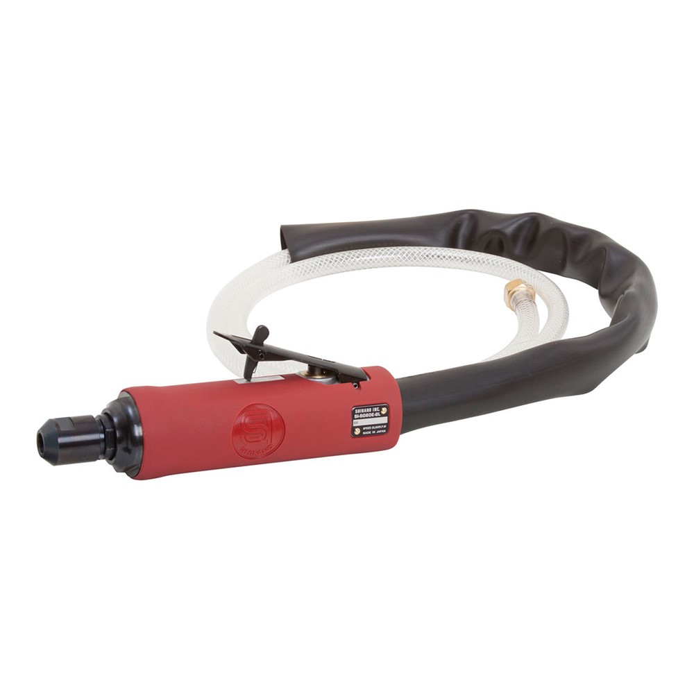 Shinano SISG60E-6L är en kraftfull filmaskin med högkvalitativ spännhylsa och flera spännytor för säkert grepp om verktyget. Maskinen har ett isolerat handtag, ljuddämparslang och en stark motor i förhållande till sin kompakta storlek – perfekt för krävande applikationer med slipstift och roterande filar.