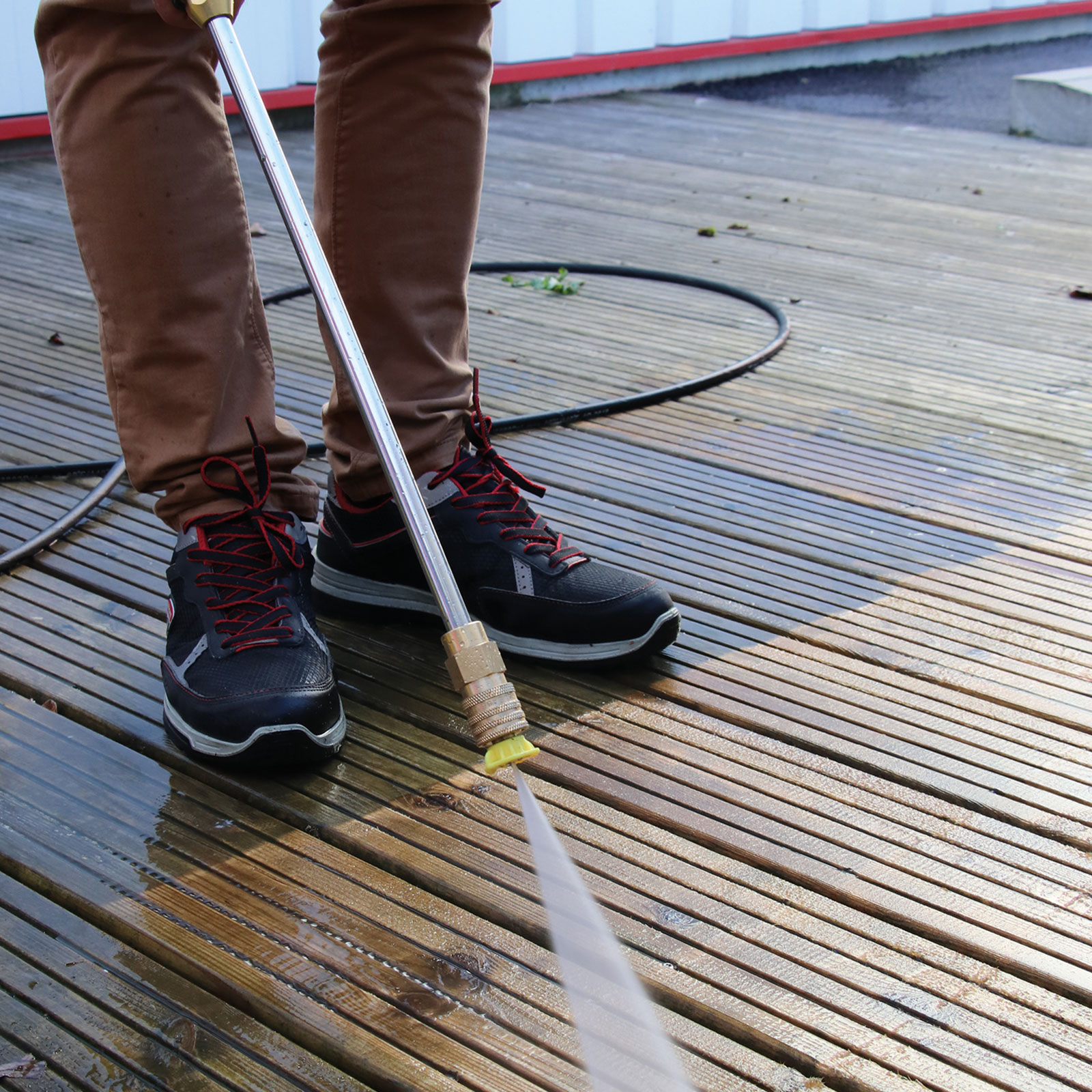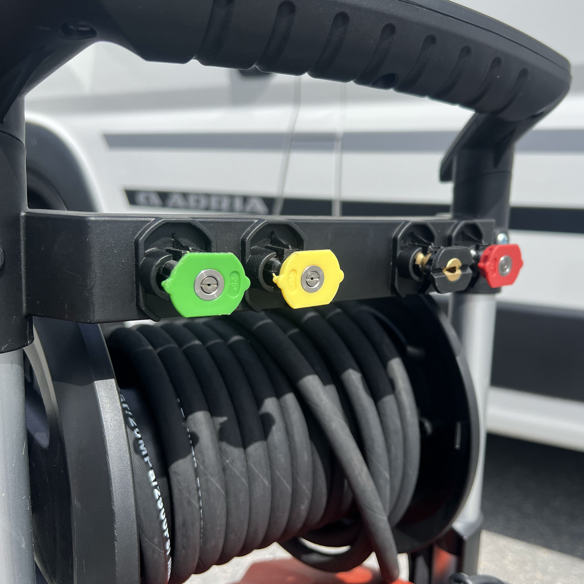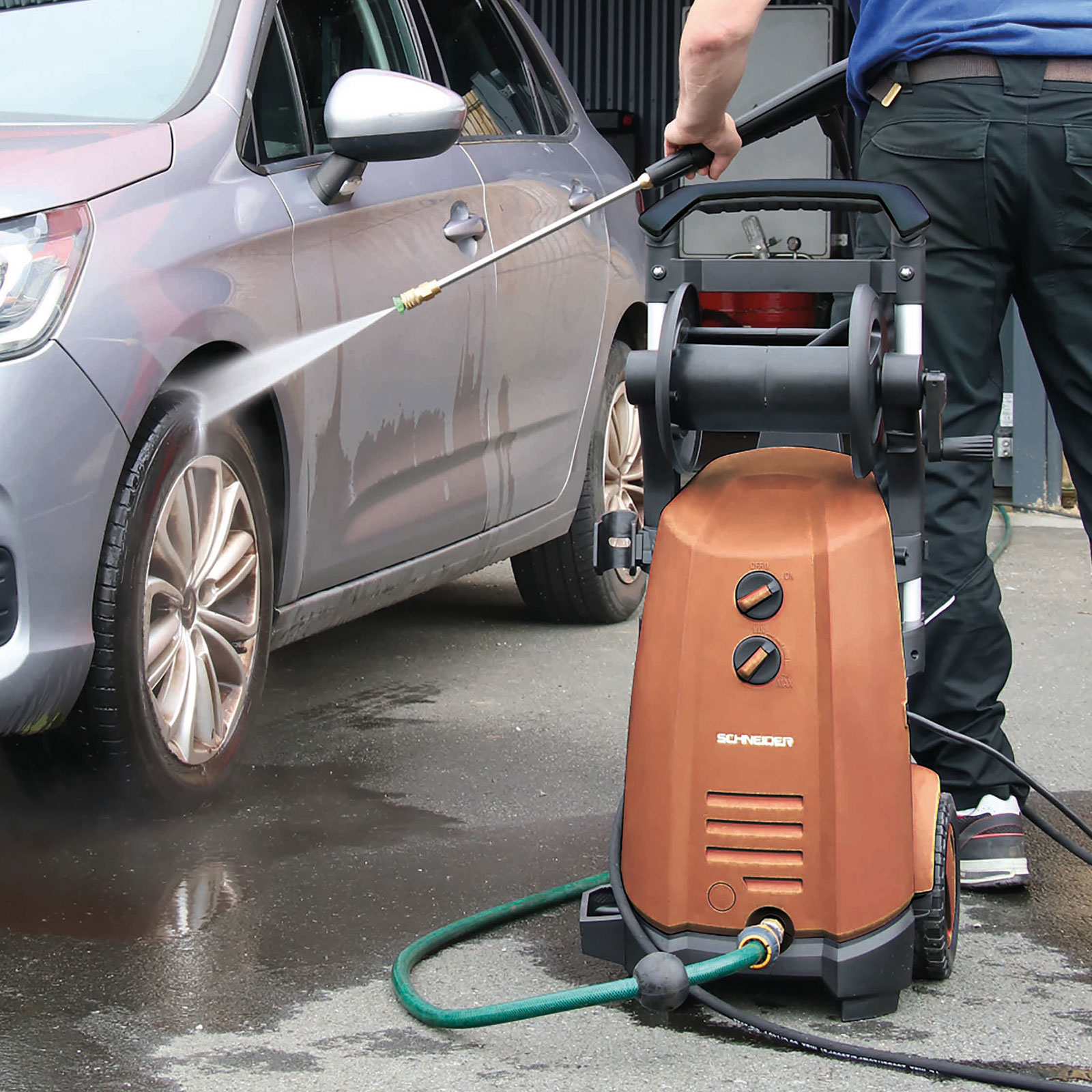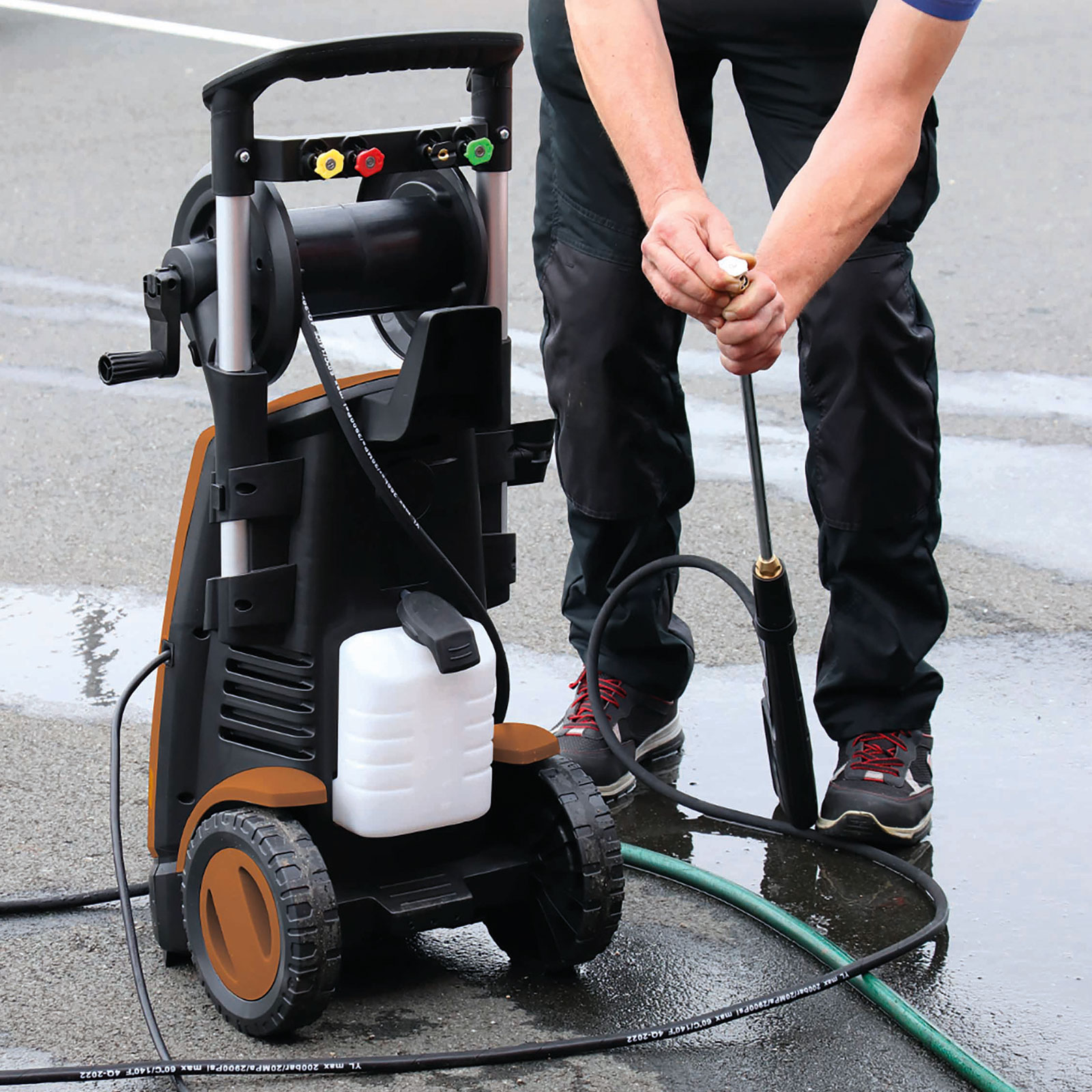 Maskinen levereras med spolhandtag i metall, 8 meter högtrycksslang på rulle med vev, integrerat 0,8 liters rengöringsmedelsbehållare, kabelhållare och fem olika munstycken – 0°, 15°, 25°, 40° och ett särskilt för dosering av kem. Med hållarna för både kabel och lans hålls utrustningen alltid organiserad. Ett robust val för allt från bilvård till rengöring av uteplatser och verktyg.
