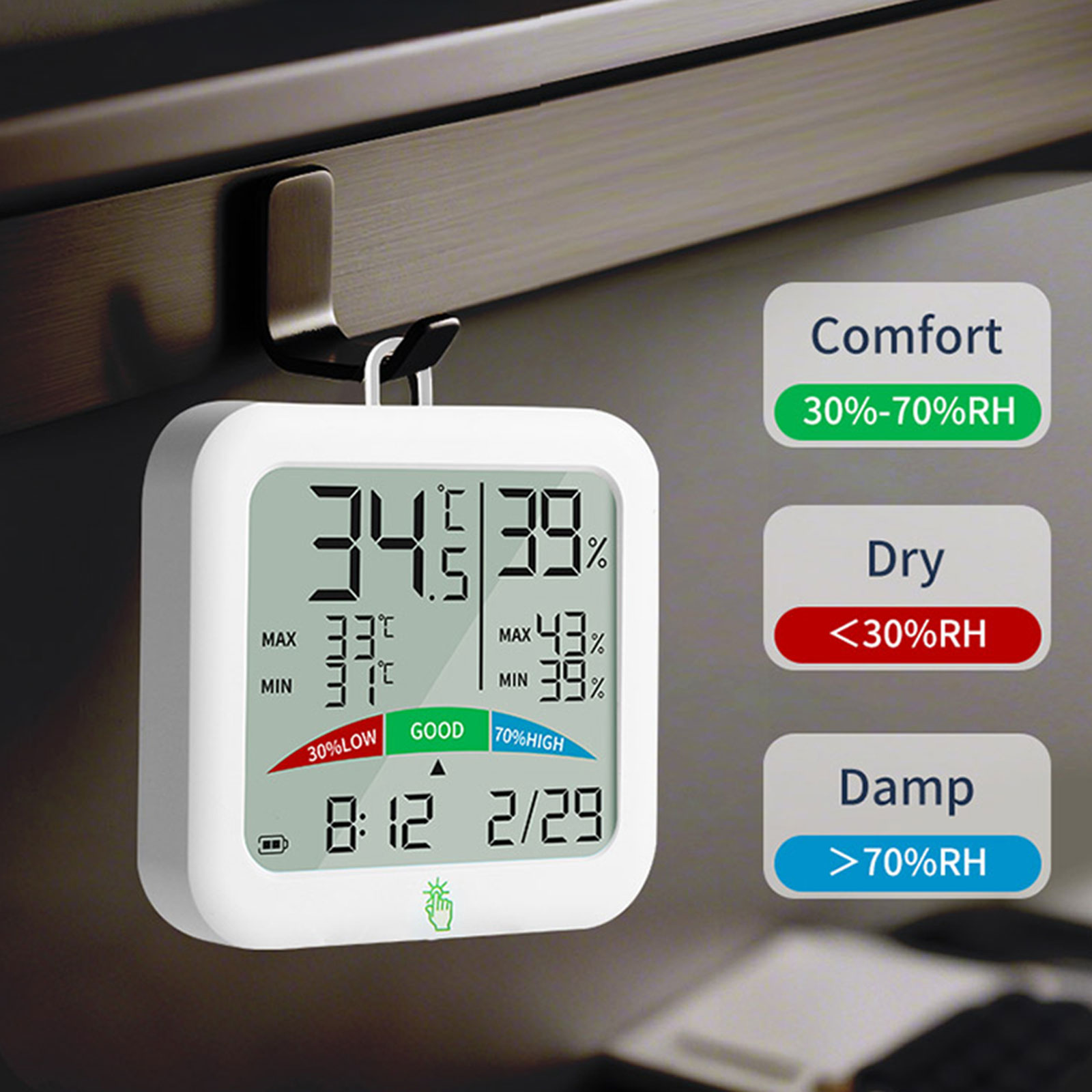 - Komfortindikator – Visar om miljön är torr, behaglig eller fuktig