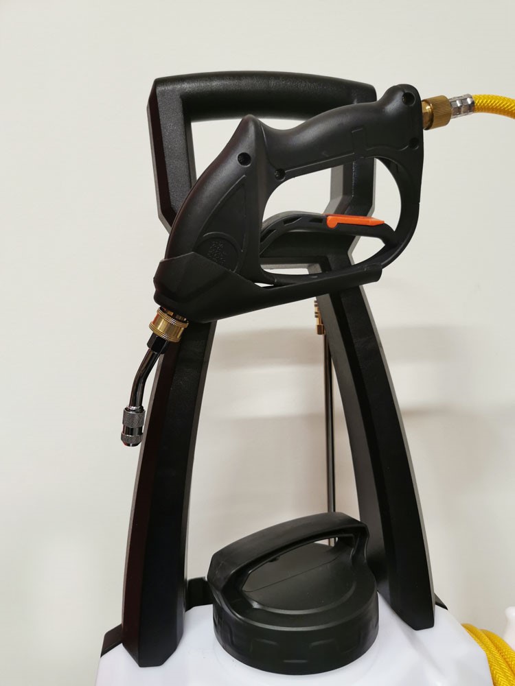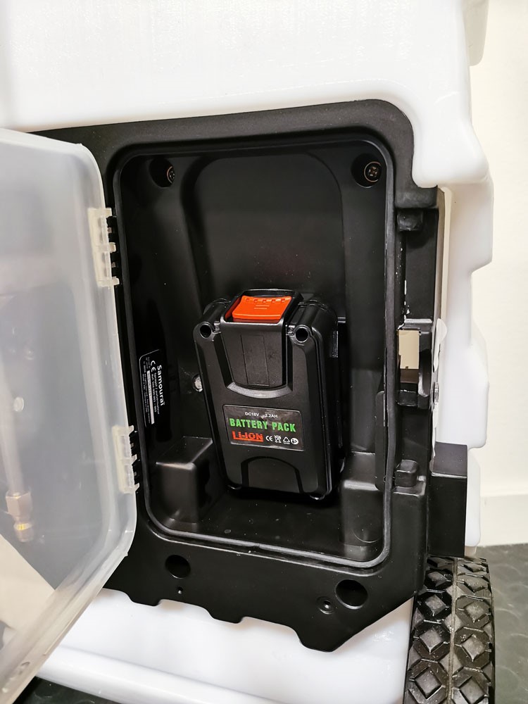 Det löstagbara 18V-batteriet av borrmaskinstyp ger upp till 120 minuters spraytid och laddas enkelt med medföljande laddare. Sprutan har två hastighetslägen och levereras komplett med 3 olika munstycken, 60 cm lans och en 6 meter lång slang. FKM-tätningarna är kemikalieresistenta, men bör inte användas med extra stark avfettning eller aggressiva syror.