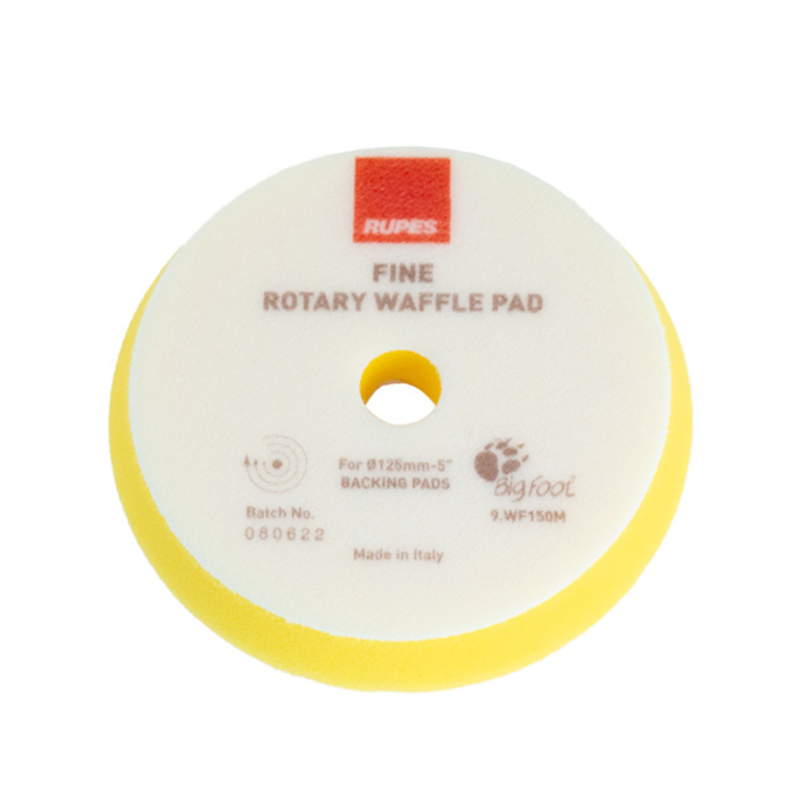 Rupes BigFoot gul våfflad skumtrissa för roterande polermaskiner. Fin avverkning med utmärkt finish. Våfflad yta minskar friktion, ger svalare polering och förbättrad följsamhet över konturer. Ger optimalt resultat tillsammans med Rupes polermedel.