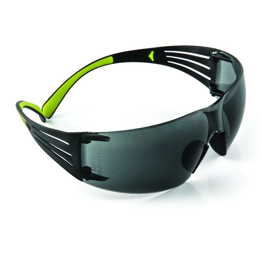 3M™ SecureFit™ 400 skyddsglasögon SF402AF, svart/grön skalm, reptåliga/imfria, grå lins, består av en kantlös lins med breda och flexibla skalmar för bra sidoskydd och god passform tillsammans med hörselkåpor. Dessa skyddsglasögon är även utrustade med 3M™ Pressure Diffusion Temple-teknik (PDT) som justeras automatiskt till användarens huvudform, för en säker och bekväm passform. Detta minskar risken för att glasögonen glider när du rör huvudet. De mjuka näsdynorna kan justeras för ännu bättre anpassning.