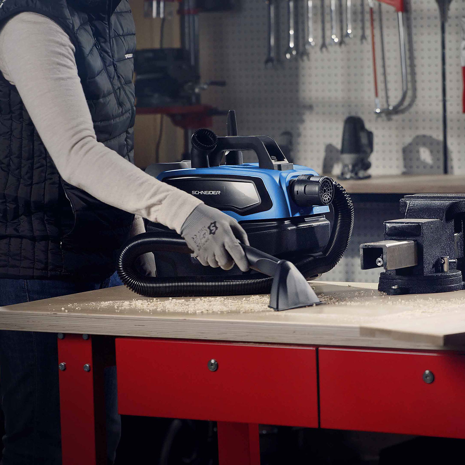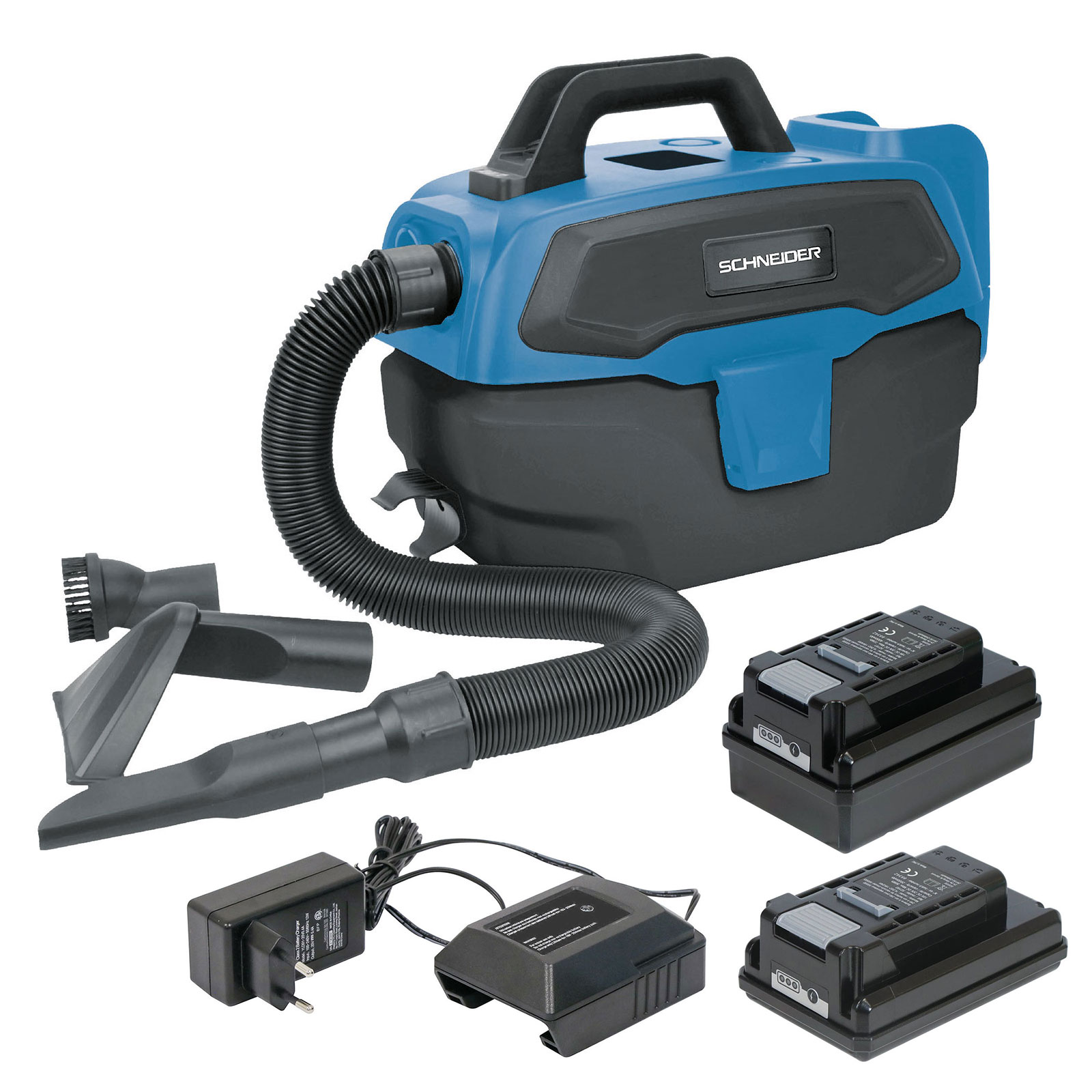 Schneider batteridrivna dammsugare är en kompakt och portabel modell för både våt- och torrsugning. Den är idealisk för mindre arbeten där flexibilitet och rörlighet är viktig, till exempel i bilen, garaget eller på byggarbetsplatsen. Dammsugaren är utrustad med integrerat handtag, förvaring för tillbehör och en praktisk blåsfunktion. Den utdragbara slangen ger extra räckvidd och underlättar arbetet i trånga utrymmen. Driftstiden är cirka 15 minuter med 2Ah-batteriet och upp till 30 minuter med 4Ah-batteriet. Två batterier och laddare ingår.